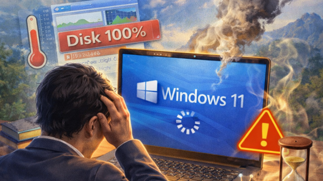 Windows Windows11が遅くなった時の対処法 Windowsが急に遅くなり、タスクマネージャーでDisk使用率が100%になる場合の原因と対処法を解説。Disk0の確認方法や、sfc /scannowコマンドによるシステム修復手順を初心者向けにわかりやすく紹介します。 2026.03.18 Windowsトラブル
